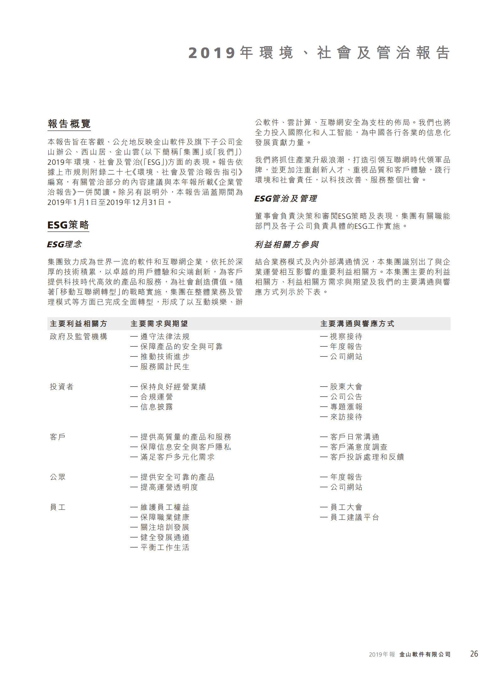 环境、社会及管治报告 2020 金山软件有限公司2020年环境、社会及管治报告 2019 金山软件有限公司2019年环境、社会及管治报告 金山软件有限公司风险管理流程及新型风险类型 金山软件有限公司职业健康与安全政策 ESG评级与奖项 Kingsoft index ratingsMSCIAA (2025)AA (2024)BBB (2023)S&P ESG 评级63 (2025)54 (2024)43 (2023) 中国上市公司协会2025年上市公司可持续发展优秀实践案例 标普全球“行业最佳进步企业”表彰 标普全球《可持续发展年鉴2025(全球版)》 中国上市公司协会2024年上市公司可持续发展优秀实践案例 标普全球《可持续发展年鉴(中国版)2024》 中国上市公司协会2023年上市公司ESG优秀实践案例
